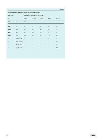 Bolt size Tightening torque for unit series