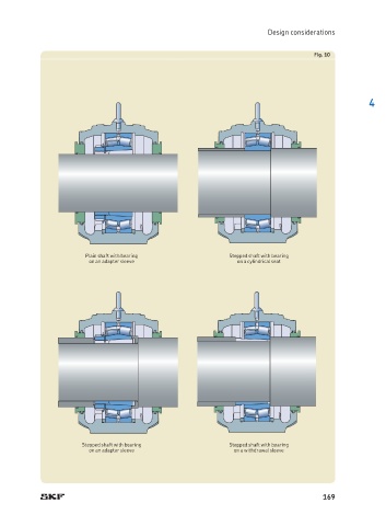 Design considerations Fig. 10 4 Plain shaft with bearing Stepped shaft with bearing on an adapter sleeve on a cylindrical seat Stepped shaft with bearing Stepped shaft with bearing on an adapter sleeve on a withdrawal sleeve 169