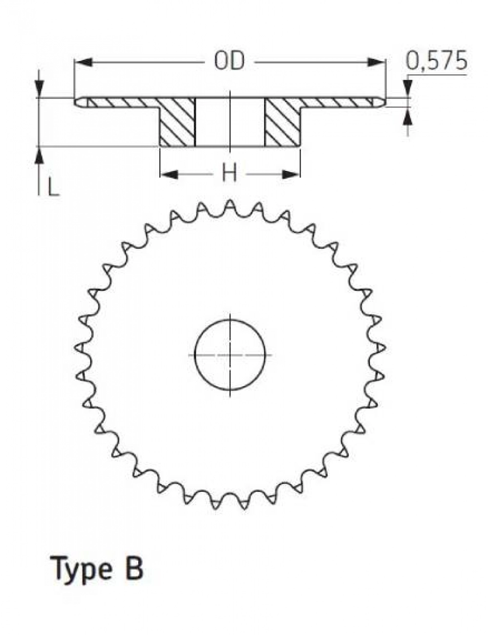 No.Teeth = 34 DIMENSIONS :Outside diameter = 11.39 in. , Type = B , Bore min. = 1 3/16 in. , Bore max. = 3 1/4 in. ,H = 4 3/4 in. , L = 2 in.